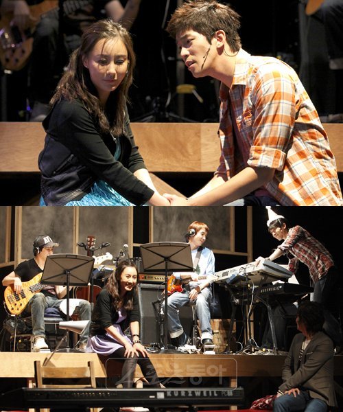 비운의 작곡가 ‘존’을 맡아 벌써부터 ‘록존’이란 애칭을 얻은 신성록(사진 위)과 윤공주의 공연 모습. ‘틱틱붐’의 최대 매력은 시원시원한 록음악에 있다. 배우들과 라이브밴드가 함께 연주(사진 아래)하고 있다.