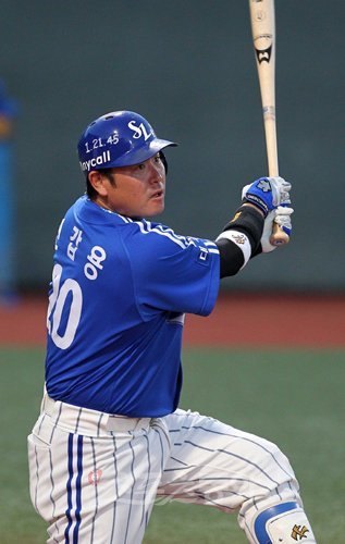 두 번째 타자 진갑용(사진)의 타구는 투수 정면으로 향했고, 직접 고창성의 왼쪽 팔뚝을 때리고 말았다. 볼은 뒤로 흘렀고, 타자는 1루에서 세이프.
