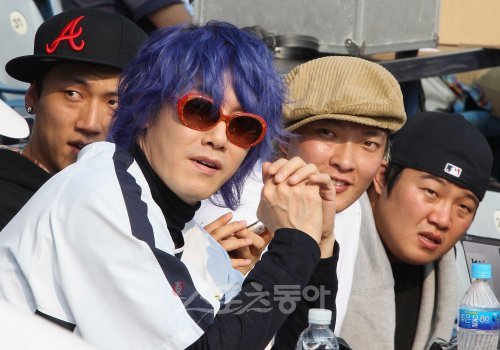 플레이오프3차전 두산 베어스와 삼성라이온즈 경기가 열린 10일 서울 잠실야구장에서 가수 김장훈(앞)이 안무팀 단원들과 경기를 보고 있다.