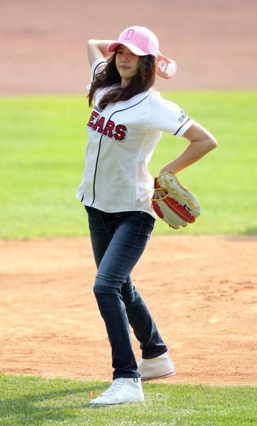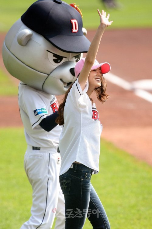 2010 프로야구 플레이오프 두산베어스 대 삼성라이온즈 3차전 경기가 10일 잠실야구장에서 열렸다. 탤런트 고아라가 시구를 하고 있다.