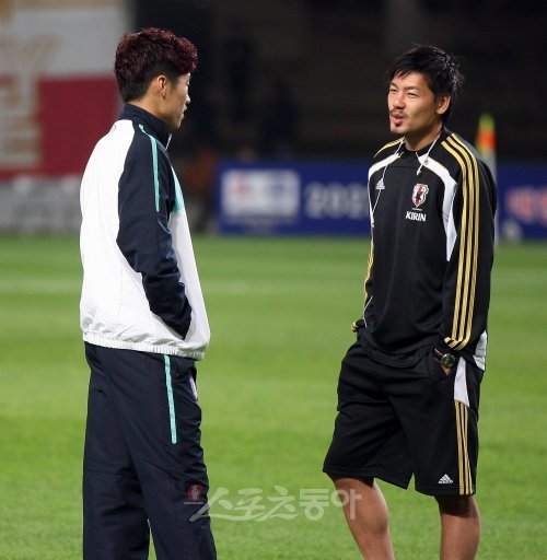 12일 저녁 서울월드컵 경기장에서 열린 대한민국과 일본의 축구국가대표팀 평가전에서 박지성이 일본의 마스이와 이야기를 나누고 있다.