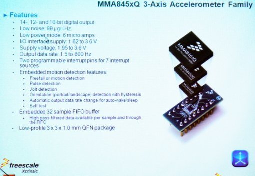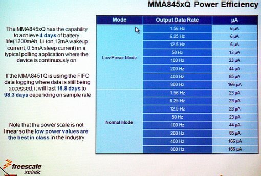 특히 이날 발표에서 프리스케일의 관계자들은 MMA845xQ 시리즈가 전력 소모가 적어 휴대폰과 같은 휴대용 기기에서 사용하기 적합하다는 것을 특히 강조했다. 자사의 테스트 결과, 일반 모드에서 4일, 절전 모드에서는 16.8일 이상 배터리 수명이 유지되는 것을 확인했다고 한다.