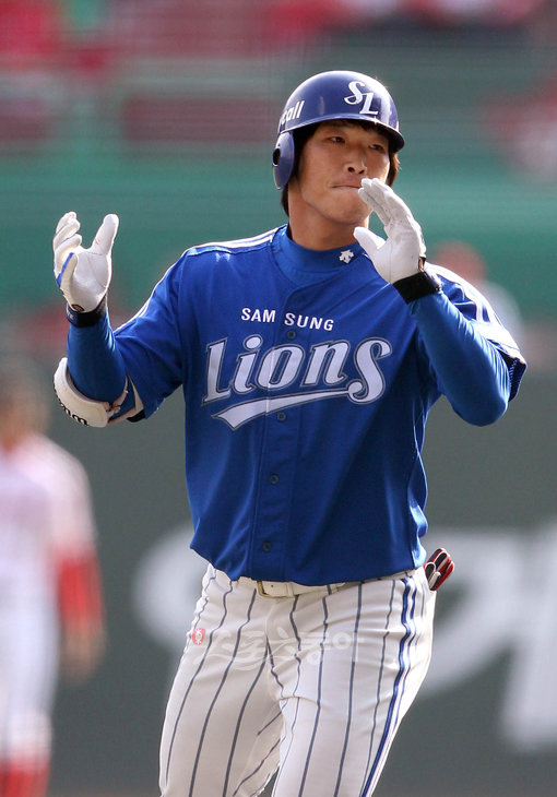 2010 프로야구 한국시리즈 2차전 SK와이번스 대 삼성라이온즈 경기가 16일 인천문학야구장에서 열렸다. 2회초 2사 1,2루 삼성 이영욱이 1타점 적시타를 친 후 기뻐하고 있다. 문학 | 김종원기자 won@donga.com