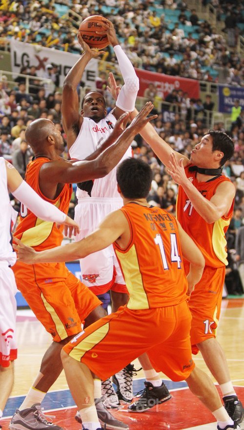 17일 오후 인천 삼산실내체육관에서 20100-2011 현대모비스 프로농구 인천전자랜드와 부산KT의 경기가 열렸다. 1쿼터 KT의 로드가 상대 수비수를 제치고 슛을 시도하고 있다.