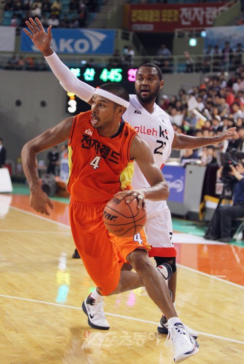 17일 오후 인천 삼산실내체육관에서 20100-2011 현대모비스 프로농구 인천전자랜드와 부산KT의 경기가 열렸다. 3쿼터 전자랜드의 문태종이 상대 수비수를 제친 후 드리블을 하고 있다.