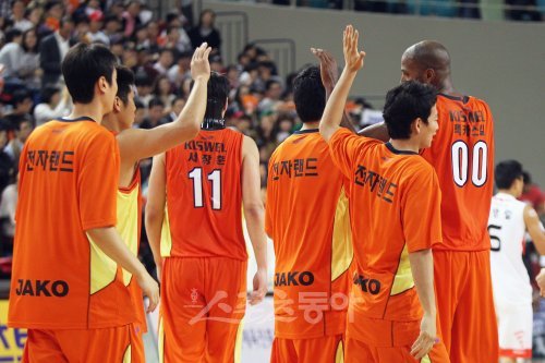17일 오후 인천 삼산실내체육관에서 20100-2011 현대모비스 프로농구 인천전자랜드와 부산KT의 경기가 열렸다. 승리한 전자랜드 선수들이 경기 종료 후 하이파이브를 하며 기쁨을 나누고 있다.