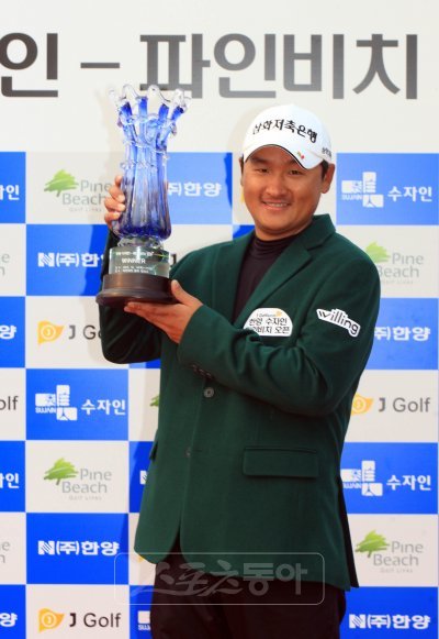17일 전남 해남 파인비치 골프장에서 열린 한양 수자인-파인비치오픈에서 우승한 김대섭이 우승 트로피를 들고 환하게 웃고 있다.
