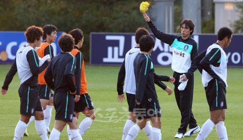 아시안게임 대표팀이 다음달 개막하는 광저우 아시안게임을 앞두고 18일 파주NFC(대표팀트레이닝센터)에 소집돼 첫 훈련을 시작했다. 홍명보 감독이 훈련 조끼를 선수들에게 나눠주고 있다.