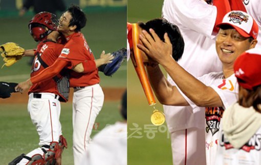 기쁨 뒤엔 슬픔이… □1 이 기쁨을 위해 치열하게 살아왔다. SK 에이스 김광현(오른쪽)이 한국시리즈 4차전 승리를 매조지한 뒤 포수 마스크를 쓴 선배 박경완과 감격적인 포옹을 나누고 있다. □2 SK 김성근 감독(오른쪽)이 9회말 위기를 이겨내고 세이브를 기록하며 한국시리즈 우승을 확정지은 김광현의 머리를 쓰다듬으며 활짝 웃고 있다. □3 삼성 양준혁(가운데)이 19일 대구구장 삼성 쪽 덕아웃에 모습을 드러냈다. 선배로서 한국시리즈 4연패라는 아픔을 겪은 후배들을 내버려둘 수 없었던 모양이다. 그래서인지 표정이 침울하다. 대구|김종원 기자 wom@donga.com