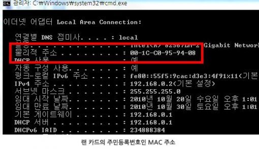 MAC 주소 역시 일반적인 사용 환경에서는 그리 활용할 기회가 없을 테지만, MS 윈도우 운영체제의 명령 프롬프트에서 ‘ipconfig /all’ 명령어를 실행하면 ‘물리적 주소’라는 항목에서 각 랜 카드 고유의 MAC 주소를 확인할 수 있다.
