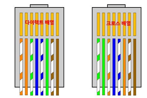UTP 랜 케이블은 8개의 가닥의 배열에 따라 다이렉트, 크로스 케이블로 구분되는데, 다이렉트 배열은 일반적으로 네트워크 장비와 컴퓨터와 연결할 때, 크로스 배열은 (허브/스위치 없이) 컴퓨터와 컴퓨터를 1:1로 연결할 때 또는 네트워크 장비끼리 연결할 때 주로 사용한다. 단, 네트워크 장비끼리는 다이렉트 배열 케이블로 연결 가능한 경우도 있다. 두 배열을 구분하는 방법은 RJ 커넥터의 바닥면(걸쇠가 없는 면)의 왼쪽부터 가닥 배열이 주황-주황 띠-초록 띠-파랑-파랑 띠-초록-갈색 띠-갈색(양 끄트머리 동일)이면 다이렉트, 초록 띠-초록-주황 띠-파랑-파랑 띠-주황-갈색 띠-갈색(한쪽 끄트머리만 해당)이면 크로스 배열이다(아래 그림 참고).