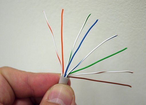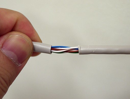 1) 케이블 피복을 약 3~4cm가량 벗겨 낸다. 내부 8개 가닥이 손상되지 않도록 조심하면서, 가위나 칼 등을 통해 알아서 재량껏 절단해 낸다.