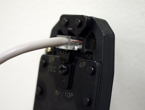5) 그 상태에서 조심스레 케이블링 툴의 RJ45 구멍에 끼운 후 툴 양쪽 손잡이를 힘껏 쥐어 RJ45 커넥터의 금속 부분이 8개 가닥을 관통하도록 한다. 손잡이를 한두 번 더 쥔 후 RJ45 커넥터를 빼내고 케이블 가닥과 금속 부분이 정확히 맞닿았는지 확인한다. 만약 한 가닥이라도 짧거나 가닥 홈으로 제대로 들어가지 않았다면, RJ45 커넥터 부분을 잘라내고, 1)~5) 과정을 반복해야 한다(일단 케이블링 툴로 작업한 RJ45 커넥터는 재활용할 수 없다. RJ45 커넥터는 개당 약 200~300원이다).