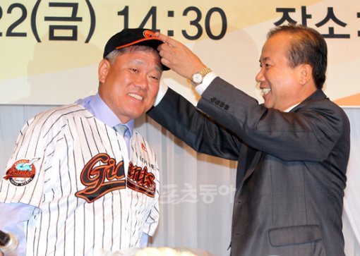 “우승하러 왔습니다” 롯데 양승호감독은 초보사령탑 답지 않게 시종일관 여유 있는 모습으로 자신의 소신을 밝혔다. 롯데 장병수 사장(오른쪽)이 양 감독에게 모자를 씌워주고 있다.잠실 | 국경원 기자 onecut@donga.com
