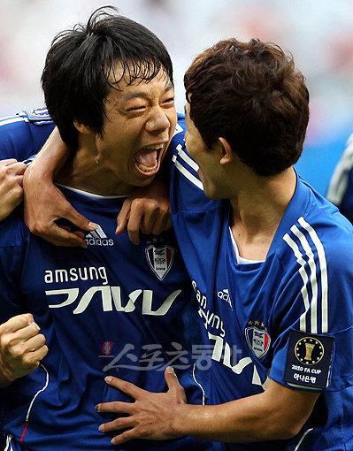 수원 삼성 염기훈(왼쪽)이 24일 부산 아이파크와 FA컵 결승전에서 전반 26분, 기습적인 왼발 중거리 슛으로 결승골을 터뜨린 뒤 동료 이상호와 함께 기뻐하고 있다. 사직 | 박화용 기자 sportic@donga.com