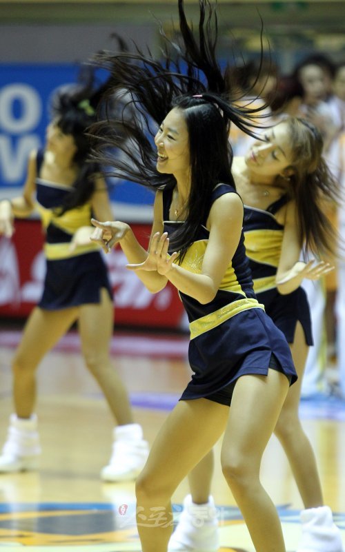 25일 오후 천안 KB인재개발원 실내체육관에서 삼성생명 2010-2011 여자프로농구 KB국민은행과 삼성생명의 경기가 열렸다. 국민은행의 치어리더들이 흥을 돋우며 공연을 하고 있다.