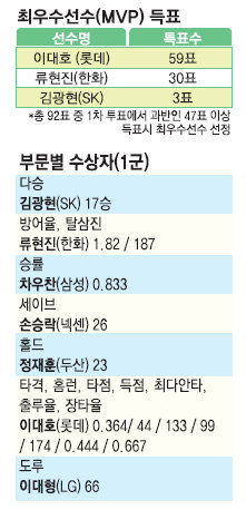 2010 시즌 타격 7관왕에 빛나는 롯데 이대호(28)가 데뷔 10년 만에 처음으로 정규리그 최우수선수(MVP)로 뽑혔다. 신인 포수 사상 최초로 20홈런 고지를 밟은 두산 양의지(23)는 최우수 신인 선수의 영광을 안았다.