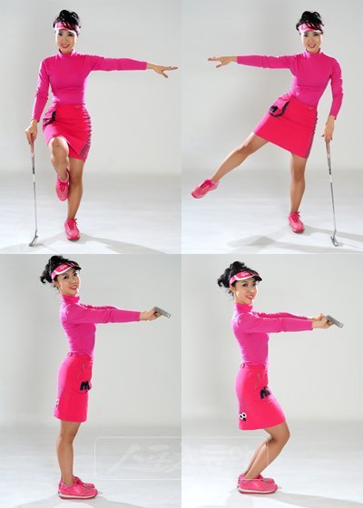 1. 서서 클럽을 오른손으로 퍼터를 잡고 왼팔을 옆으로 들어올린다. 이때 오른 무릎을 접고 중심을 잡는다. 10초 정지, 좌우 교대 3회 반복.