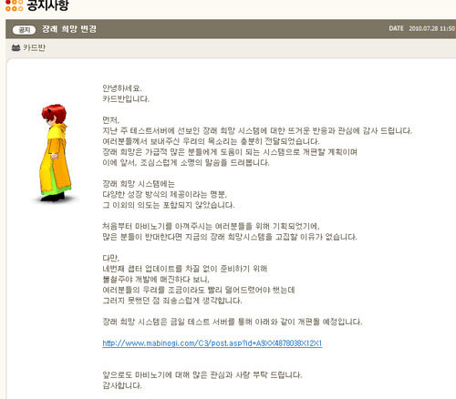 결국 개발사측은 한 발 물러서, 내용을 완화하는 방향으로 조정할 수 밖에 없었으며 콘텐츠의 내용도 스킬 수련치 증가와 스탯 보너스 등 성장에 도움이 되는 시스템으로 개편됐다.