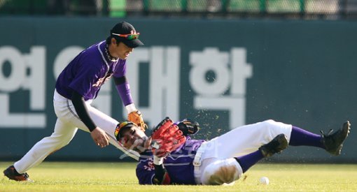 3O일 오후 서울 잠실구장에서 한국 프로야구 OB회인 일구회가 지난 6월 뇌경색으로 의식을 잃고 쓰러진 KIA 타이거즈 김동재 코치를 돕기 위해 천하무적 야구단과 자선경기를 가졌다. 3회초 1사 상황에 선두 타자 류중일의 타구를 중견수 마리오가 아쉽게 놓치고 있다. 일구회 포수 유승안. 잠실 | 임진환 기자 photolim@donga.com