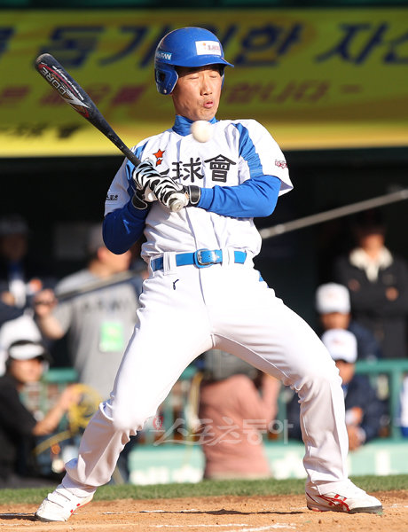 3O일 오후 서울 잠실구장에서 한국 프로야구 OB회인 일구회가 지난 6월 뇌경색으로 의식을 잃고 쓰러진 KIA 타이거즈 김동재 코치를 돕기 위해 천하무적 야구단과 자선경기를 가졌다. 6회말 무사 2루 상황에 김동수가 투수 김동희의 몸쪽볼에 놀라고 있다. 잠실 | 임진환 기자 photolim@donga.com