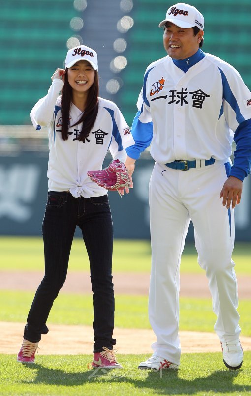 3O일 오후 서울 잠실구장에서 한국 프로야구 OB회인 일구회가 지난 6월 뇌경색으로 의식을 잃고 쓰러진 KIA 타이거즈 김동재 코치를 돕기 위해 천하무적 야구단과 자선경기를 가졌다. 경기에 앞서 시구를 마친 홍수아를 3루 코치 양준혁이 격려하고 있다. 잠실 | 임진환 기자 photolim@donga.com