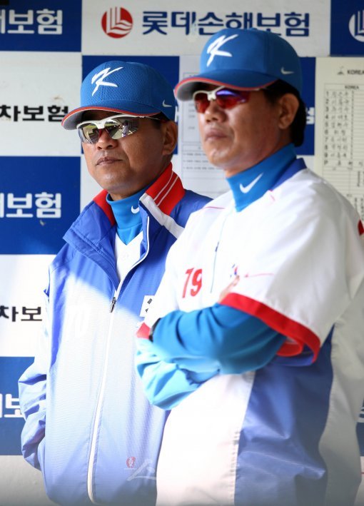 첫 모의고사 후 쏟아진 숙제들. 2010 아시안게임 야구국가대표팀을 이끌고 있는 조범현 감독(왼쪽)과 김시진 투수코치가 1일 사직에서 치러진 KIA와 연습경기를 무거운 표정으로 지켜보고 있다. 사직 | 김종원 기자 won@donga.com