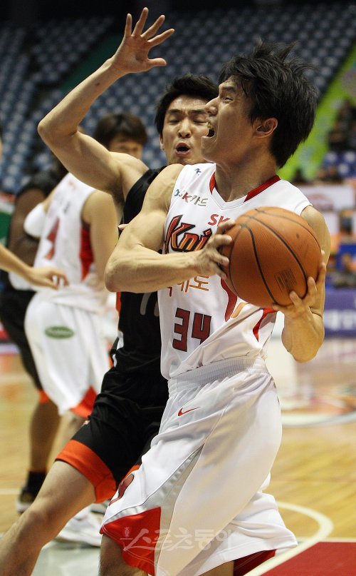 3일 오후 부산 사직실내육관에서 열린 2010-2011 현대모비스 프로농구 부산 KT와 서울 SK의 경기에서 골밑 슛을 시도하던 SK 김효범이 KT 박성운의 밀착마크를 피해 골밑돌파를 시도하고 있다.