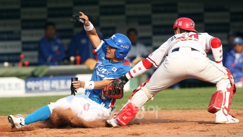 2010 광저우 아시안게임에 출전하는 야구 국가대표팀이 5일 부산 사직야구장에서 기아 타이거즈와 연습경기를 가졌다. 8회초 1사 2, 3루 상황, 추신수의 희생플라이에 홈으로 쇄도하던 3루 주자 이종욱이 홈에서 아웃되고 있다.