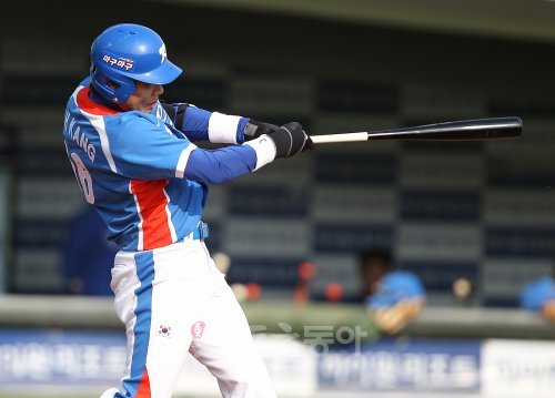 2010 광저우 아시안게임에 출전하는 야구 국가대표팀이 5일 부산 사직야구장에서 기아 타이거즈와 연습경기를 가졌다. 4회초 1사 1루 상황에 강정호가 투런포를 때려내고 있다.