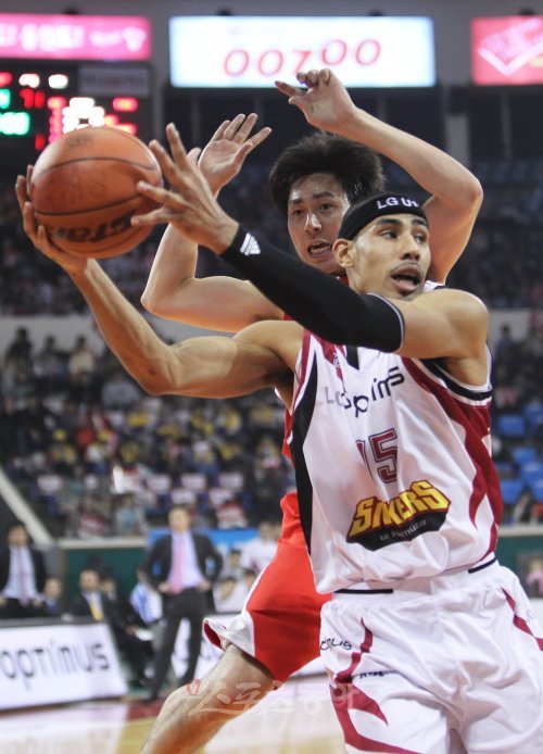 5일 서울 잠실 학생체육관에서 `2010-2011 현대모비스 프로농구` 서울SK 나이츠와 창원LG 세이커스의 경기가 열렸다. LG의 문태영이 상대 수비를 제치고 리바운드볼을 잡고 있다.
