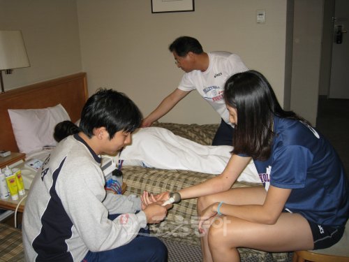 ● 마사지…선수들에게 가장 중요한 것이 몸이다. 몸에 이상이 있으면 곧바로 마사지실을 찾는다. 대개 잠자리에 들기 전에 가는 곳이다. 부상부위를 살피거나 뭉친 근육을 풀어준다. 황연주, 정대영, 김사니, 김연경이 단골 멤버다. 가장 많이 받는 부위는 무릎이나 어깨 부위. 배구선수니 어쩔 수 없다.
