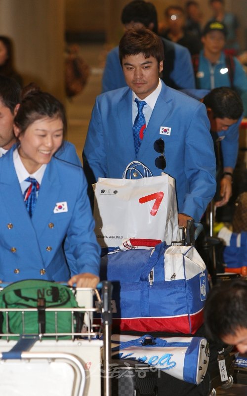 아시안게임에서 8년 만에 정상을 탈환한 한국 야구대표팀 선수들이 21일 오후 인천국제 공항을 통해 금의환향 했다. 추신수가 게이트를 빠져나오고 있다.