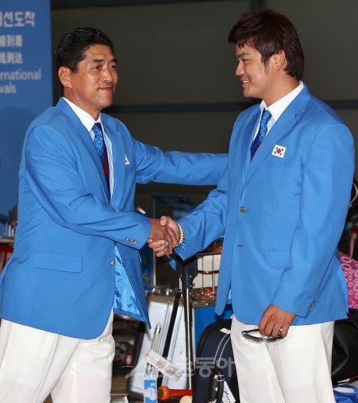 “수고했어” “감사합니다” 야구 대표팀 사령탑 조범현 감독(왼쪽)은 금메달을 따냈다는 안도감 덕분인지 귀국 이틀째인 22일을 찜질방에서 ‘땀을 빼면서’ 보냈다. 28일 KIA 마무리훈련을 지휘하러 일본 미야자키로 떠날 예정. 반면 추신수는 23일 롯데호텔 홍보대사로 공식 위촉되면서 박찬호의 뒤를 잇는 ‘국민 메이저리거’로서 첫 발을 내딛는다. 인천공항|임진환 기자 photolim@donga.com