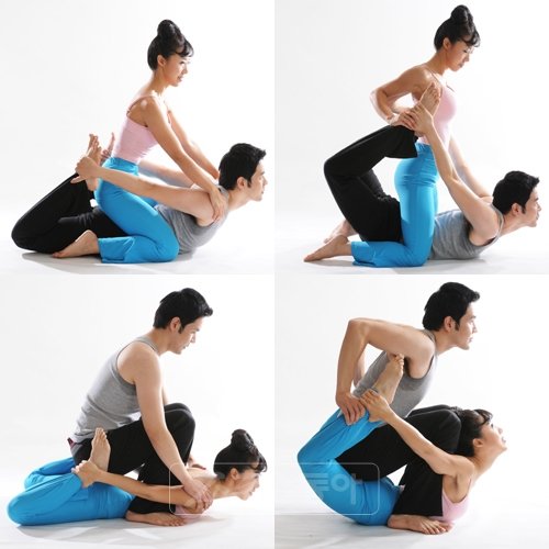 1. 남성이 엎드려서 양 발목을 잡고 여성은 남성의 엉덩이에 앉아 어깨를 주물러준다.