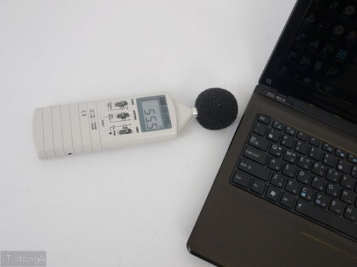 소음은 거의 나지 않는다. 발열구에 귀를 가까이 대어야 미세하게 팬이 돌아가는 소리가 들린다. 보다 정확한 측정을 위해 소음(데시벨) 측정기를 사용해 봤으나 생활 소음 때문에 묻혀 노트북 소음을 파악할 수 없었다. 평소 58dB 전후의 소음이 발생하는 사무실에서 발열구에 바짝 갖다 댄 결과 데시벨은 거의 변하지 않았다. 이 정도면 조용한 곳에서 노트북을 사용해도 누가 눈치주지 않을 수준이다. 물론 고사양 게임 등을 실행할 때는 내부 팬 소음이 다소 발생하긴 하지만, 정숙한 도서관이 아닌 이상 큰 무리는 없을 듯하다. 참고로 조용한 사무실의 일상 소음이 약 50dB 정도다.