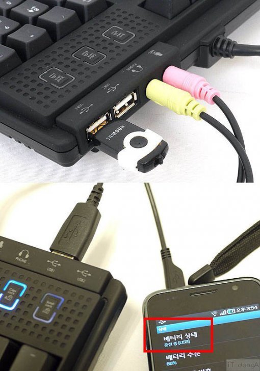 넘버락, 캡스락, 스크롤락 LED도 다른 키보드와는 사뭇 다른 모양이다. 물론 모양만 다를 뿐 별 다른 기능은 없다. 이 LED 위로 USB 2.0 포트 2개와 사운드, 마이크 단자가 달려 있다. 즉 키보드 케이블에 있는 USB 포트와 사운드/마이크 잭을 컴퓨터에 각각 꽂으면 USB 허브로, 사운드/마이크 연결 잭으로 사용할 수 있다. USB 메모리를 자주 사용하는 경우에는 대단히 간편하고 유용할 것이라 생각한다. 테스트한 바로는 USB 메모리 인식은 당연하고, 스마트폰용 USB 케이블을 연결하니 이동식 디스크로 정상 인식됐고, 본체 충전도 가능했다.