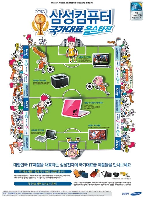 올해 4월부터 6월까지 삼성센스는 ‘2010 삼성컴퓨터 국가대표 올스타전’이라는 판촉 행사를 진행해 높은 호응을 이끌어냈습니다. 동계올림픽과 월드컵 등 굵직한 스포츠 행사가 유난히 많았고 그에 따른 국민들의 응원 열기 역시 뜨거웠습니다. 이 같은 이슈를 노트북, 데스크탑 컴퓨터, 모니터, 프린트 등 삼성전자의 국가대표급 IT제품을 풍성한 사은품과 함께 구매할 수 있는 기회라는 판촉 아이템으로 이어갔습니다.