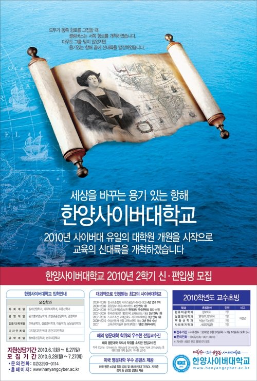 이번에 스포츠동아 광고대상 수상의 영광을 차지하게 된 ‘콜럼버스’편 광고는 용기 있는 항해 끝에 신대륙을 발견한 콜럼버스의 개척자 정신을 본보기로 삼아서 국내 최고 원격대학에 만족하지 않고 더 나은 교육환경을 위해 끊임없이 노력하는 한양사이버대학교의 열정과 비전을 담고 있습니다.