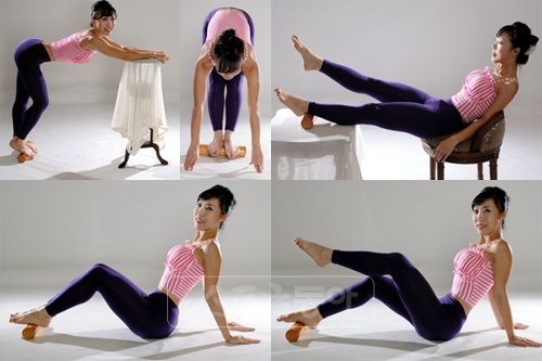 1. 발바닥에 펌프나 나무토막 등을 놓고 상체를 90도로 숙여 테이블 위에 양팔을 뻗는다. 이때 오른 무릎을 굽히고 고개도 우측으로 돌린다. 반대방향으로도 동일하게 수련한다. 10초 정지, 좌우 교대 10회 반복.