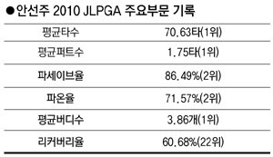 안선주는 28일 일본 미야자키현 미야자키 골프장에서 끝난 투어챔피언십 리코컵에서 공동 2위에 올라 상금왕과 신인상, 최저타수상, 다승왕을 확정지었다. 국내투어에서 7승을 올리면서 2인자에 머물렀던 안선주가 마침내 1인자로 등극한 순간이다.
