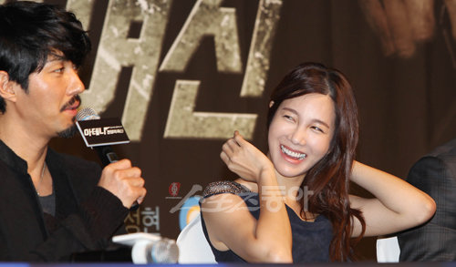 배우 이지아가 30일 오전 서울 광진구 광장동 워커힐호텔 무궁화홀에서 열린‘아테나: 전쟁의 여신(제작 (주)태원엔터테인먼트/ (주)에이치플러스커뮤니케이션))' 제작발표회에서 차승원의 대답을 들으며 밝게 웃고 있다.