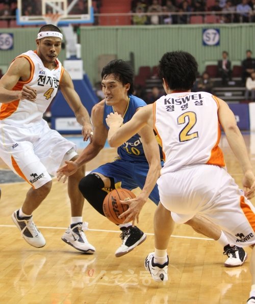 30일 오후 서울 잠실실내체육관에서 열린 2010-2011 현대모비스 프로농구 서울 삼성 썬더스와 인천 전자랜드 엘리펀츠의 2라운드 맞대결, 삼성의 차재영이 전자랜드 문태종과 정영삼의 마크를 뚫고 있다.