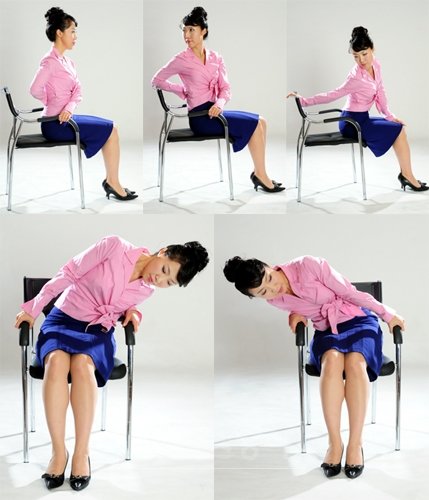 1. 의자에 앉아서 오른손바닥을 허리에 놓고 왼손은 의자의 오른쪽 손잡이를 잡는다.