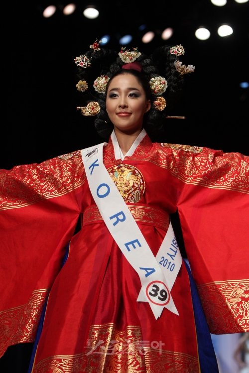 12일 오후 서울 광진구 광장동 쉐라톤워커힐호텔 씨어터홀에서 열린 ‘제 23회 월드미스유니버시티2010’본선 세계대회에서 한국 참가자 최정화(연세대)씨가 전통의상 패션쇼에서 한복의 맵시를 뽐내고 있다.