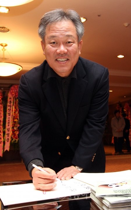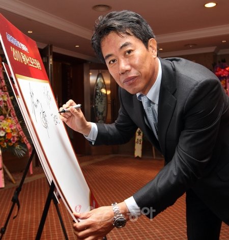 스타감독들도 동아스포츠대상을 빛냈다. 사인보드에 자취를 남기는 ‘영원한 국보’ 선동열(삼성·위) 감독과 넥센 김시진(가운데) 감독. 2010광저우아시안게임 금메달을 이끈 KIA 조범현(아래왼쪽) 감독과 롯데의 신임 사령탑 양승호 감독도 함께했다.