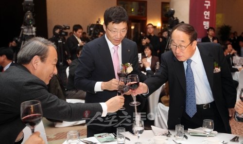 동아일보 김재호 사장(가운데)과 박용성 대한체육회장(오른쪽), 유영구 한국야구위원회 총재가 ‘동아스포츠대상’ 시상식을 마치며 축하의 건배를 하고 있다.