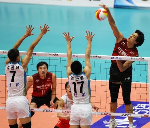14일 성남실내체육관에서 열린 남자 프로배구 V-리그 신협상무와 LIG손해보험의 경기에서 LIG 김요한이 수비벽을 두고 공격하고 있다.