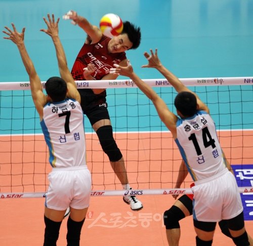 14일 성남실내체육관에서 열린 남자 프로배구 V-리그 신협상무와 LIG손해보험의 경기에서 LIG 이경수가 수비벽을 두고 거센 공격을 하고 있다.