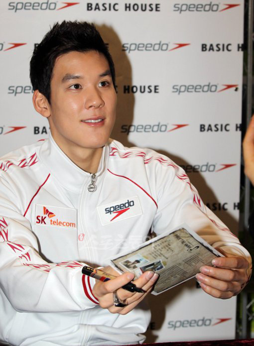19일 오후 서울 삼섬동 현대백화점 무역센터점에서 2010 광저우 아시안게임 수영 3관왕을 기록한 박태환이 한 팬에게 사인을 주고 있다.